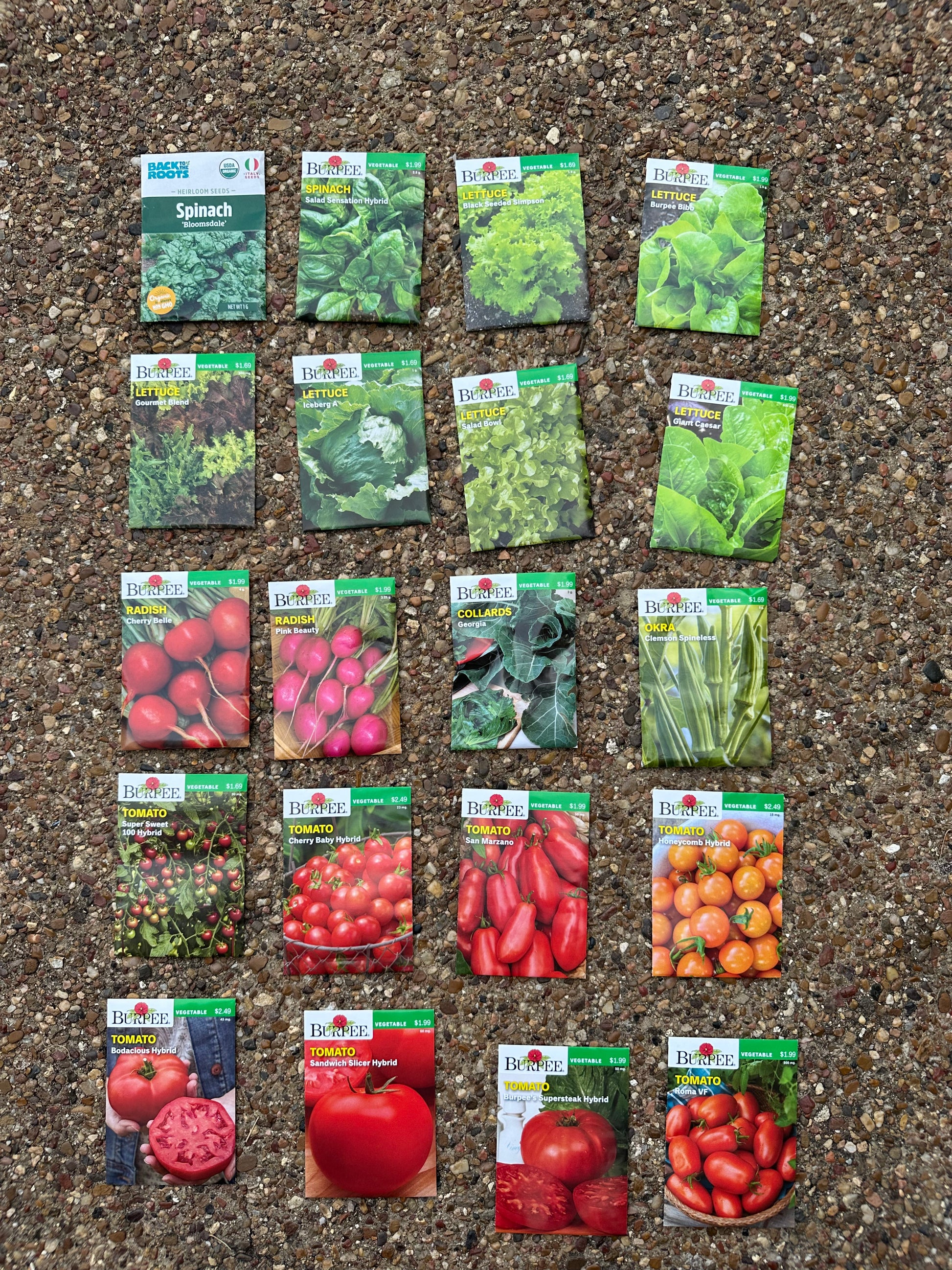 Each bag will contain a variety pack of 10 vegetable seeds valued at $1.69 - $2.49 per pack, for only $10! Possible seeds in your grab bag include but are not limited to the following: Tomato, Cucumber, Peppers, Lettuce, Squash, Carrots, Spinach, Peas, Beans, Corn, Radish, Beets, etc.
